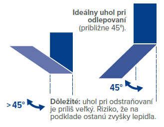 - Väčší uhol (> 45°) zvyšuje pravdepodobnosť, že lepidlo zostane na povrchu.